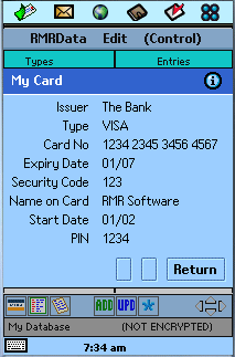 RMRData is a database program for easy reference of all your important personal information. It allows secure storage, by password protection and file encryption, of details of your financial accounts, credit cards, pin numbers, lock and key numbers, usernames and passwords, website logins, software codes, passport and other personal information, and much, much, more. Entries are categorized under Types using various form layouts - use those supplied or create your own. Then easily view the full details of each entry on screen, or just the key details on quick view cards, again using those supplied or creating your own.