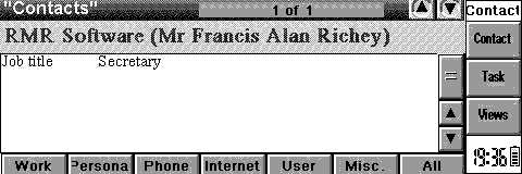 RMRContact is currently the closest equivalent to Act! for Symbian OS V5.0 machines. Not only will RMRContact help you to manage a list of your contacts (Companies, colleagues, friends etc.), but it also provides a quick and easy way to assign various tasks you need to complete with them against their name or details.